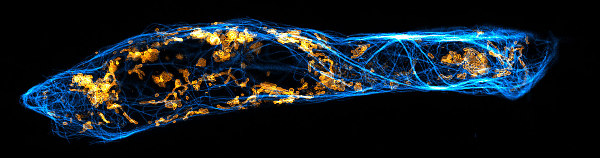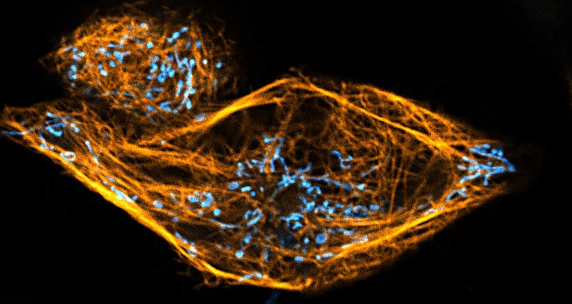 生細胞のミトコンドリア(シアン、abberior LIVE 510 mito)と微小管(オレンジ、abberior LIVE RED tubulin)を標識しSTEDYCONの共焦点モードで撮影。