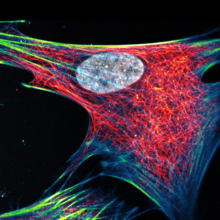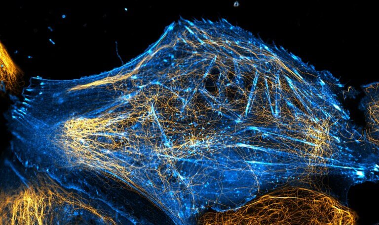Composite of three color live-cell image of an adherent mammalian cell. This living cell was directly labelled with abberior LIVE 510 actin (blue/green), LIVE 560 DNA (gray) and LIVE 610 tubulin. This image was acquired with an abberior STEDYCON microscope.