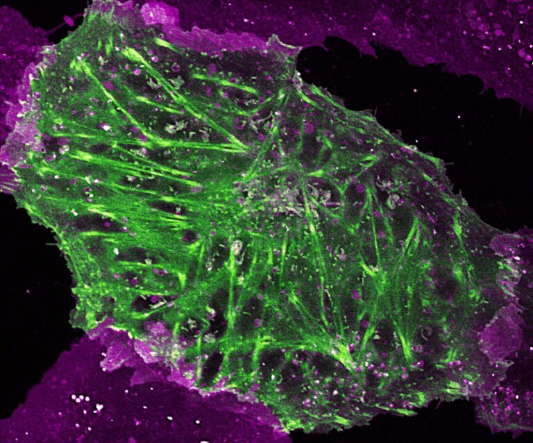 生細胞の2色STED像。actin K118TAGにTCO\*Aを導入しabberior LIVE 590 (緑)で標識したものと、abberior STAR RED membrane(マゼンタ)で標識した細胞膜を撮影。