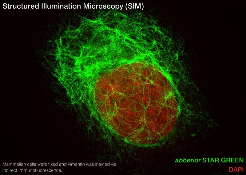 固定した哺乳類細胞。DAPI(赤)、そしてVimentin(緑、abberior STAR GREEN)を染色。