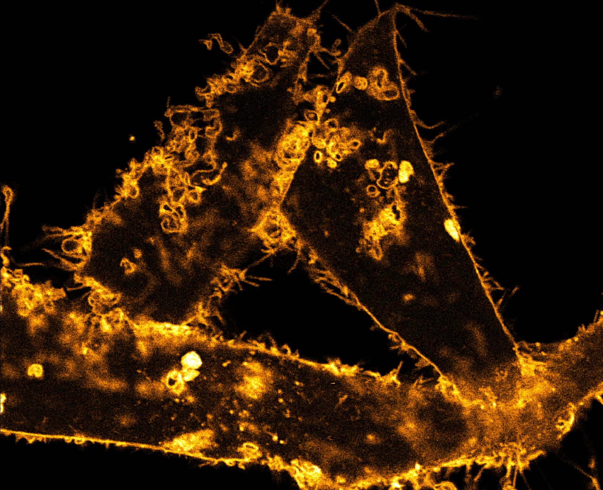 哺乳類培養細胞を、STAR 488 membraneで細胞膜のみ染色したSTED/confocal像。STEDにより細胞膜の微細な構造が明らかとなっている。STAR 488はのSTED像は、Facilityの595nm STEDレーザーで取得した。