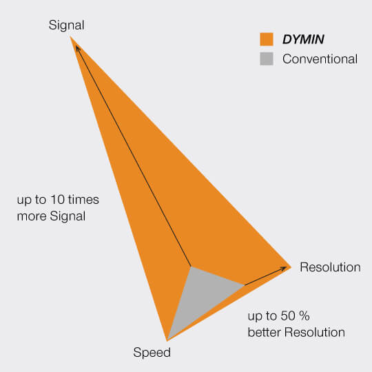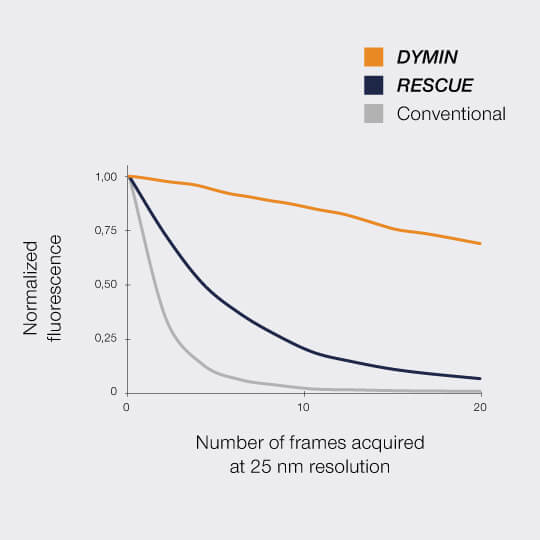 DYMINは、少量のSTED光を段階的に照射して構造をプロービングします。構造が検出されない場合は照明を遮断し、存在する場合のみ段階的にSTED光の強度を高めます。少量のSTED光でも大きな分解能向上が得られるため、必要な場合のみ完全な分解能のSTED光を照射することで、光ブリーチングを大幅に低減します。