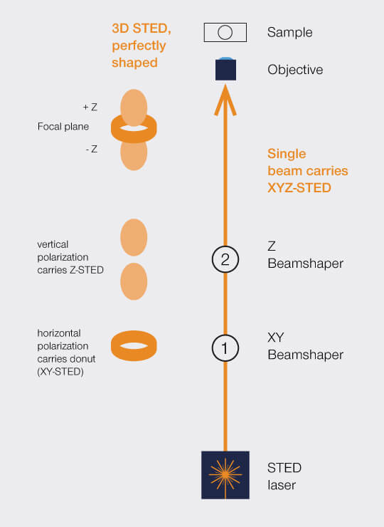 SLMにより、横方向(XY)と軸方向(Z)の解像度向上に従来の2本の別々のSTEDビームの代わりに、単一のSTEDビームのみで対応する革新的な設計が実現しました。解像度向上をXY優先からZ優先まで柔軟に調整できます。単一ビーム設計によりビーム合成やアラインメントが不要となり、卓越したシステム安定性が得られます。