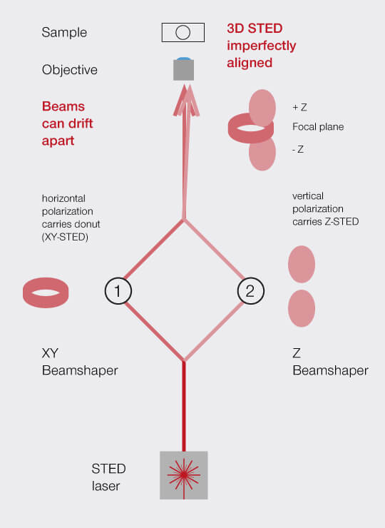 左図:従来の3D STED光路。XYとZのSTED光を別々の光路で作成するため、位置合わせがずれやすい。