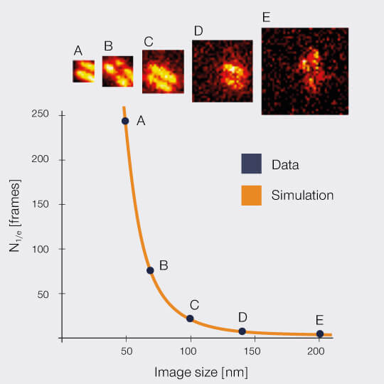 MINFIELDは、視野全体にSTED-ドーナツをスキャンするのではなく、蛍光マーカーが局在する領域に対してSTED-ドーナツの低パワーコア領域のみをスキャンします。撮像領域を回折限界より小さい範囲に限定することで、STED分野では比類のない分解能が実現します。