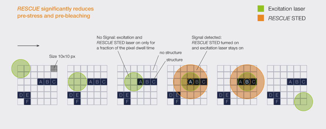右図:RESCUE STED。励起光のみでスキャンを行った後、シグナルが検出された箇所のみSTED光を照射するため、STED光による褪色の影響を抑えることができます。
