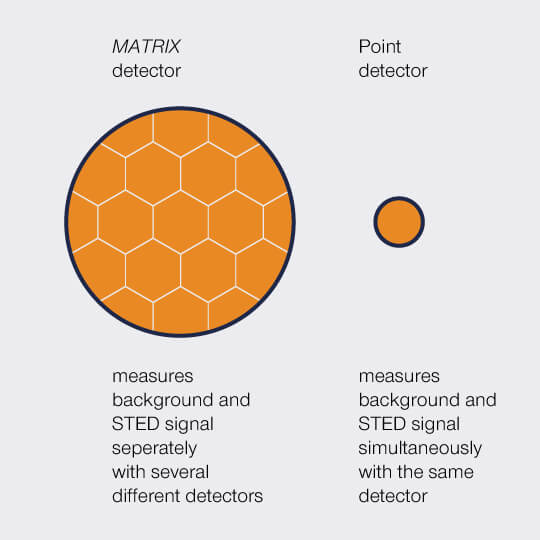 Abberior社のMATRIX検出器は、23個の個別素子で構成され、回折限界を超える高分解能と優れた信号対バックグラウンド比を実現します。各素子がピンホール機能を備えることで焦点選択性を確保しつつ、全素子の信号を統合することで広面積検出器同等の光集約性を実現し、高信号強度と高分解能を同時に達成できます。