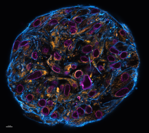 核膜孔(マゼンタ)、アクチン骨格(青)、ミトコンドリア(オレンジ)で染色されたスフェロイドの共焦点スティッチングイメージ。スケールバー:10μm。