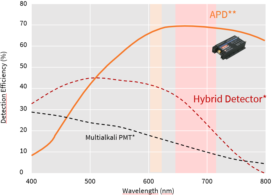 アバランシェフォトダイオード(APD、QE:~65%@650nm)