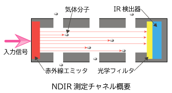 多くのガス分子は分子振動により特定波長の赤外線を吸収し、その量 ( 吸光度 )はガス分子の量に比例します。測定チャンネルにて IR エミッタより出力される赤外線はガスにより吸収されます。検出器直前に設置されている光学フィルタは特定波長以外の赤外線を除去し、ガス濃度を測定します。センサ内には測定および比較チャンネルが内蔵されており、光源のエージングを常に補正します。